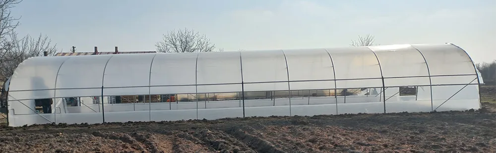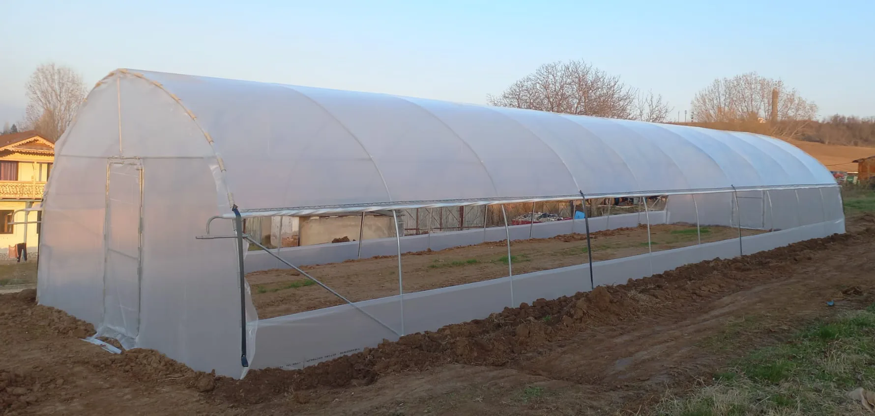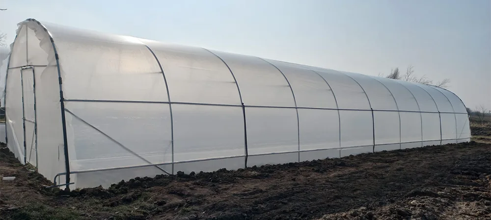 - Folie triplustratificată cu protecție UV, EVA, IR, 180 microni: Menține o temperatură constantă în interior, protejând culturile de radiații excesive.